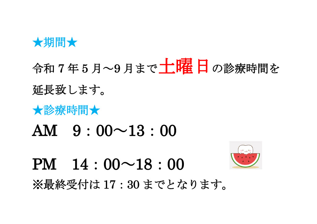 【5月~9月】サマータイム実施のお知らせ(土曜日のみ)